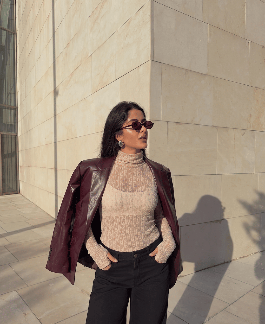 Detalhes: Renda com textura em relevo, Modelagem ajustada, Gola alta, Manga longa com dedinho, Transparência leve