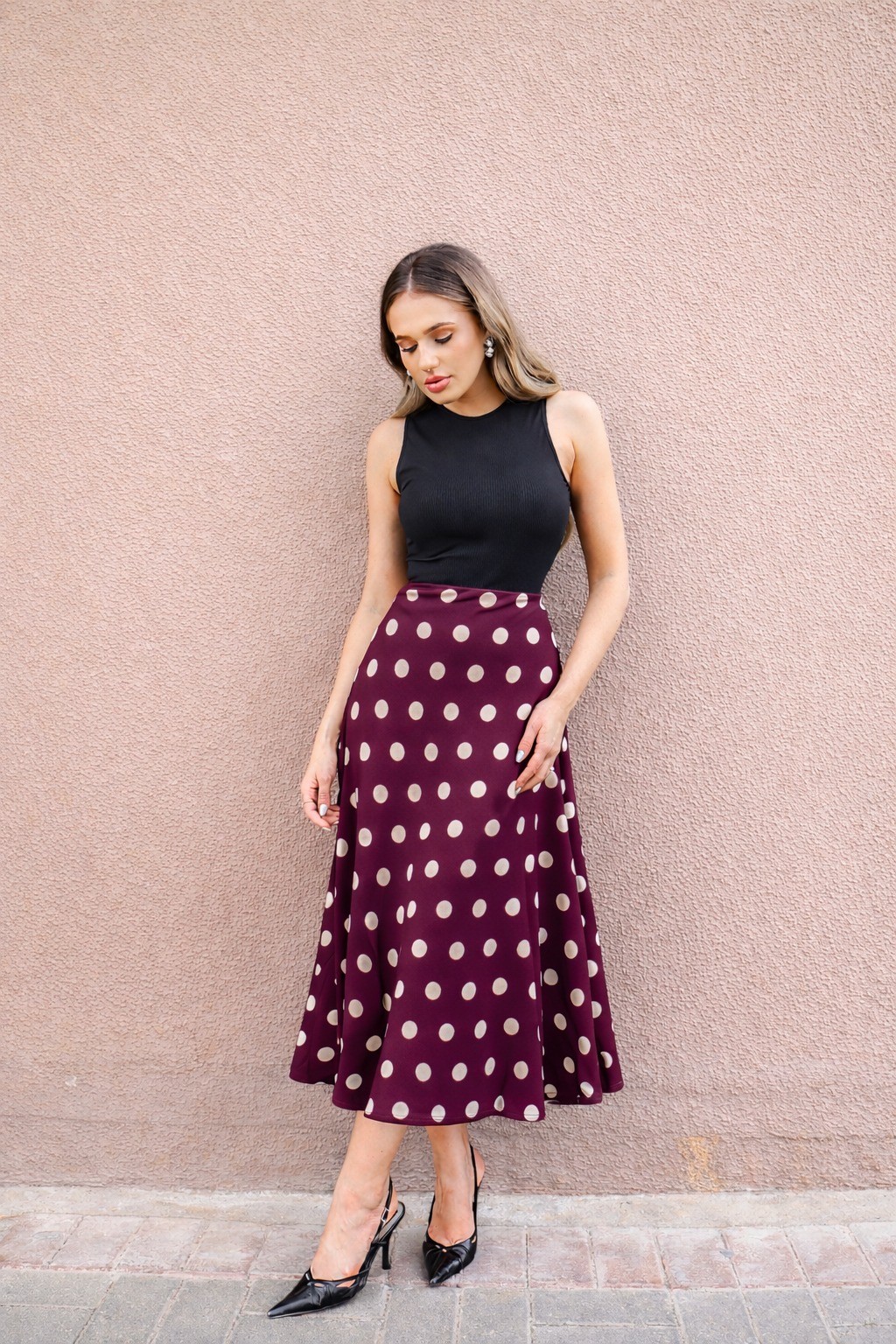 A Saia Midi – Poá Vinho traz o equilíbrio perfeito entre elegância e leveza. Com modelagem evasê e confeccionada em chiffon, ela oferece um caimento fluido e delicado, ideal para composições femininas e sofisticadas em diversas ocasiões.