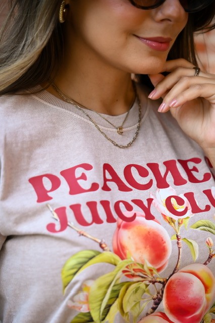 Tradução: Pêssegos frescos ao sol. Clube dos Pêssegos Suculentos – maduros ao sol, aveludados, suculentos e doces. Da Casa Lokahi.