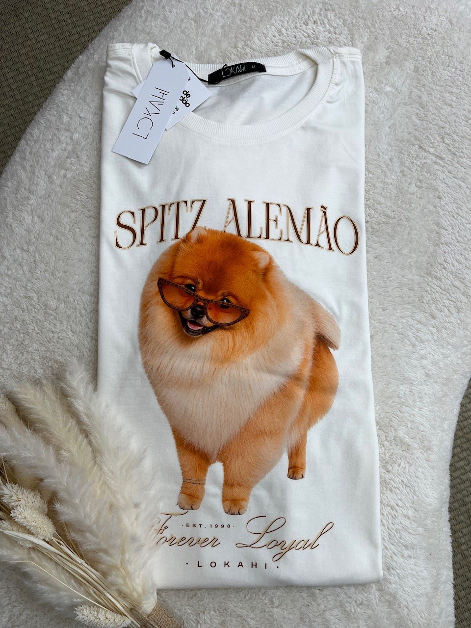Detalhes: Gola redonda com ribana, reforço ombro a ombro e estampa em DTF (Direct to Film).